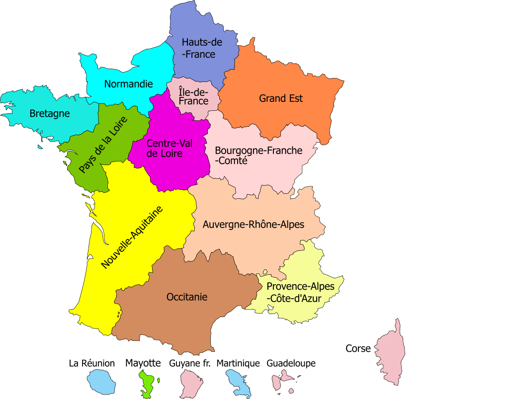 - Mapa político de Francia: con las regiones y nombres de ciudades principales.