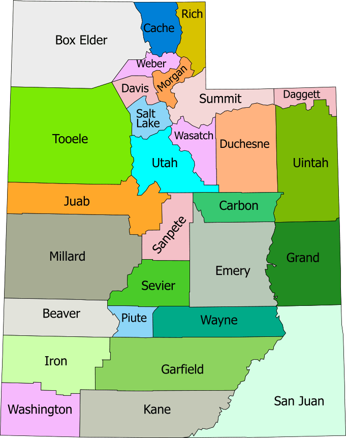 Este mapa es perfecto para profesores, estudiantes, viajeros o cualquier persona que necesite una vista clara del estado de Utah y su organización territorial.